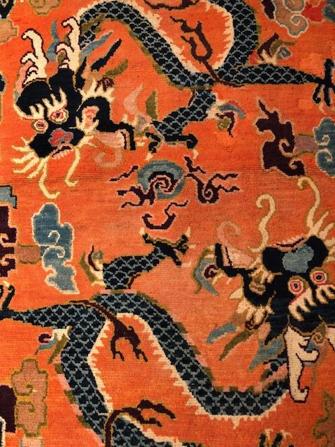 The rugs made in China have symbols like the Dragon (a beneficial animal that embodies the imperial royalty), the Flaming pearl and others that stand out on light and gilded monochrome fields rather than blue. These symbols often have a Taoist or Buddhist origin. Otherwise in the Tibetan tradition we find rugs with the same symbolism but close to peonies and lotus flowers made with more vivid and contrasting colours such as orange, the color of the monks.